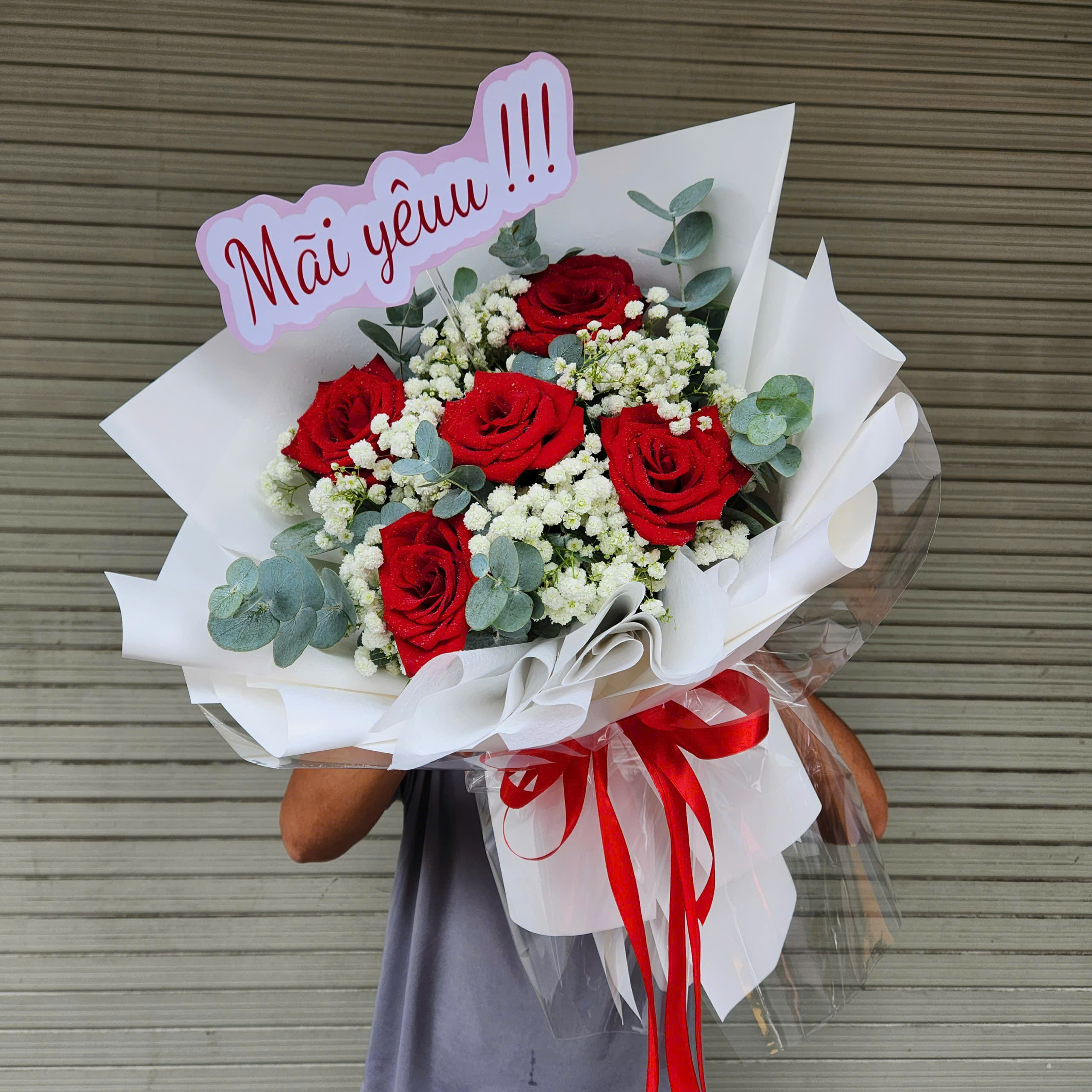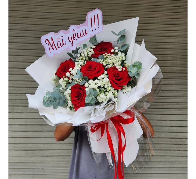 Nổi bật với 5 bông hồng đỏ tươi thắm, bó hoa này tượng trưng cho một lời hứa vĩnh cửu: "Anh yêu em mãi mãi". Số 5 trong tình yêu mang ý nghĩa về sự gắn bó, sự tin tưởng và mong muốn được đồng hành cùng nhau trên con đường dài.