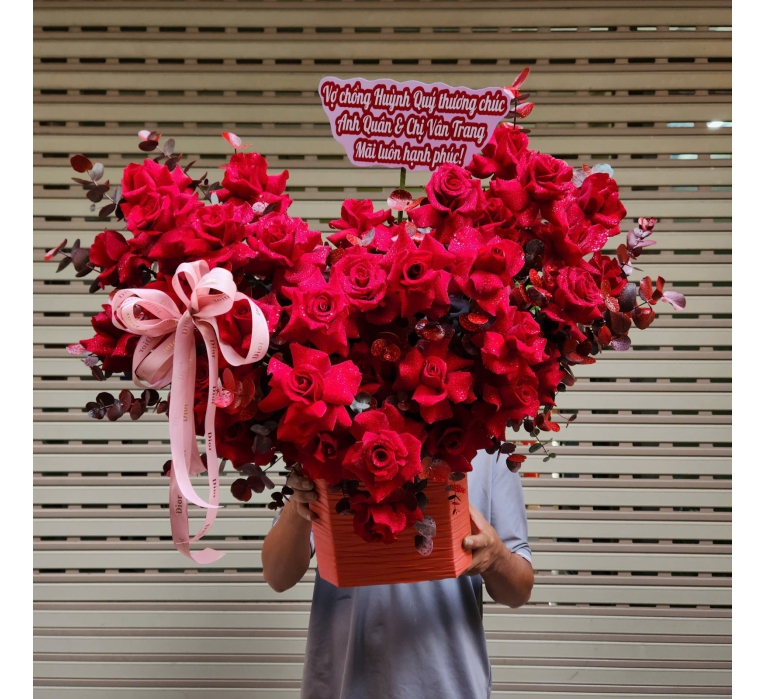 Màu đỏ rực rỡ của hoa hồng không chỉ thu hút ánh nhìn mà còn tượng trưng cho tình yêu sâu đậm, lòng nhiệt huyết và sự dũng cảm. Từng cánh hoa mềm mại, e ấp ôm lấy nhụy vàng như muốn kể một câu chuyện tình lãng mạn, bất diệt. Mùi hương thoang thoảng, dịu nhẹ của hoa hồng đỏ còn có khả năng xoa dịu tâm hồn, mang lại cảm giác thư thái và hạnh phúc. Một giỏ hoa hồng đỏ sang trọng luôn tạo ấn tượng mạnh mẽ ngay từ cái nhìn đầu tiên, khiến người nhận cảm thấy được yêu thương và đặc biệt.