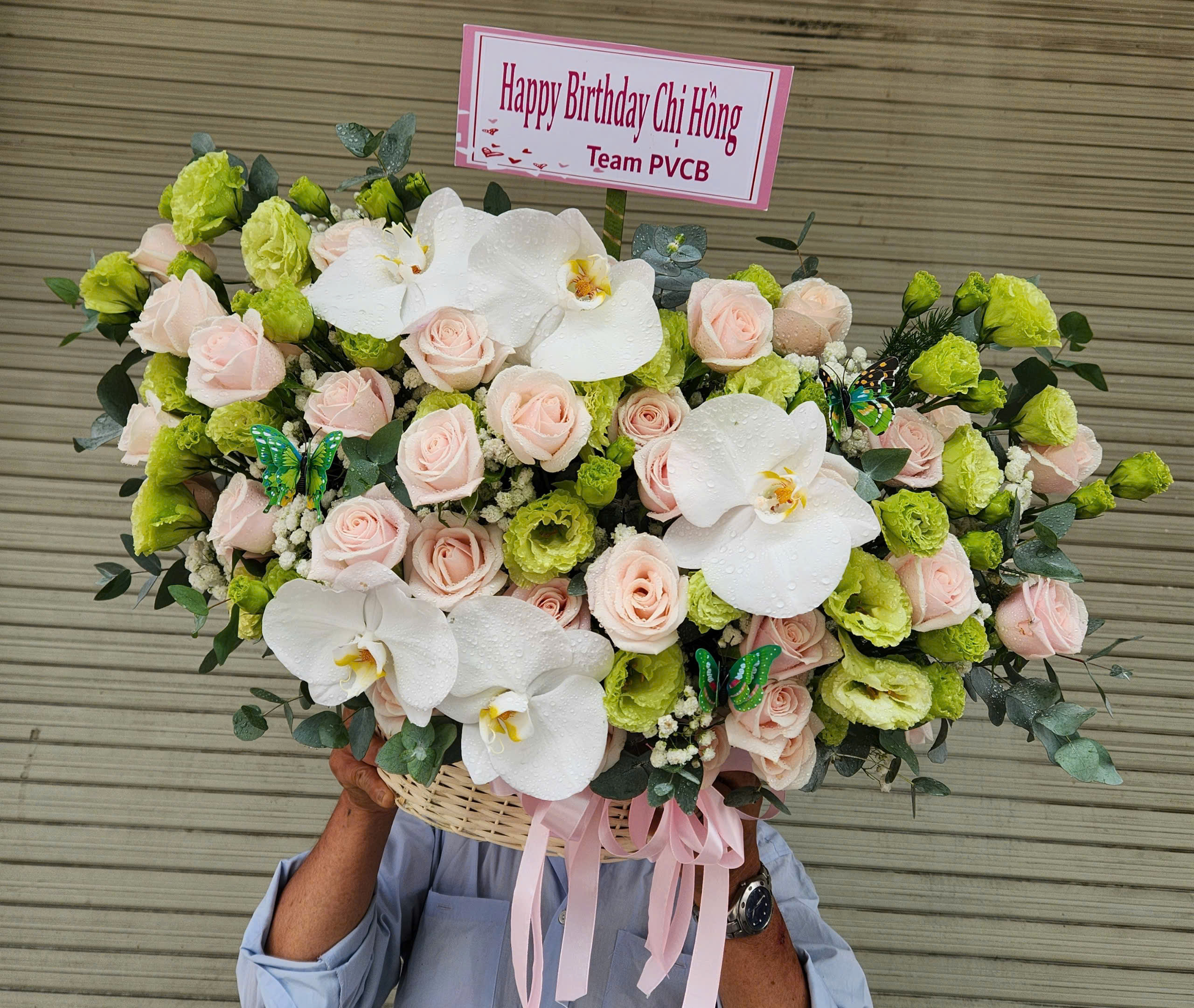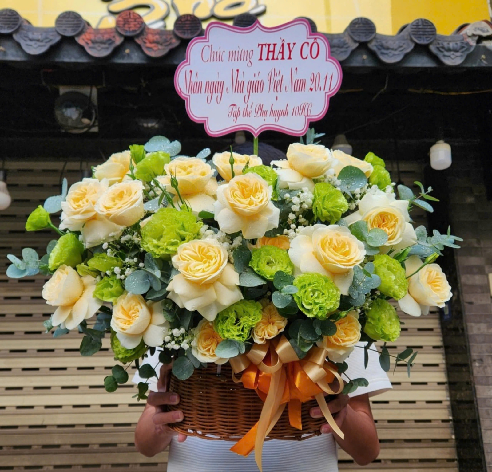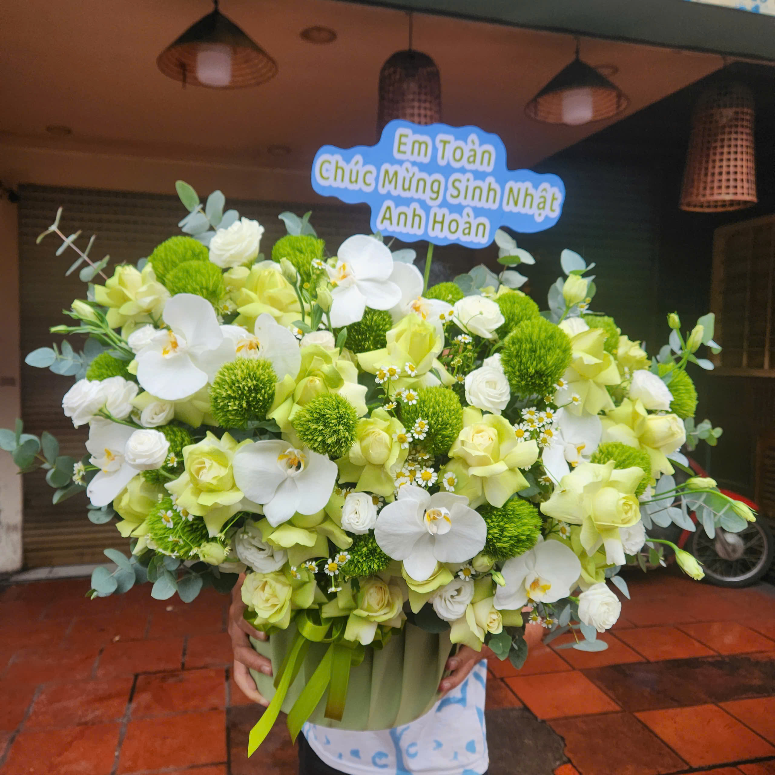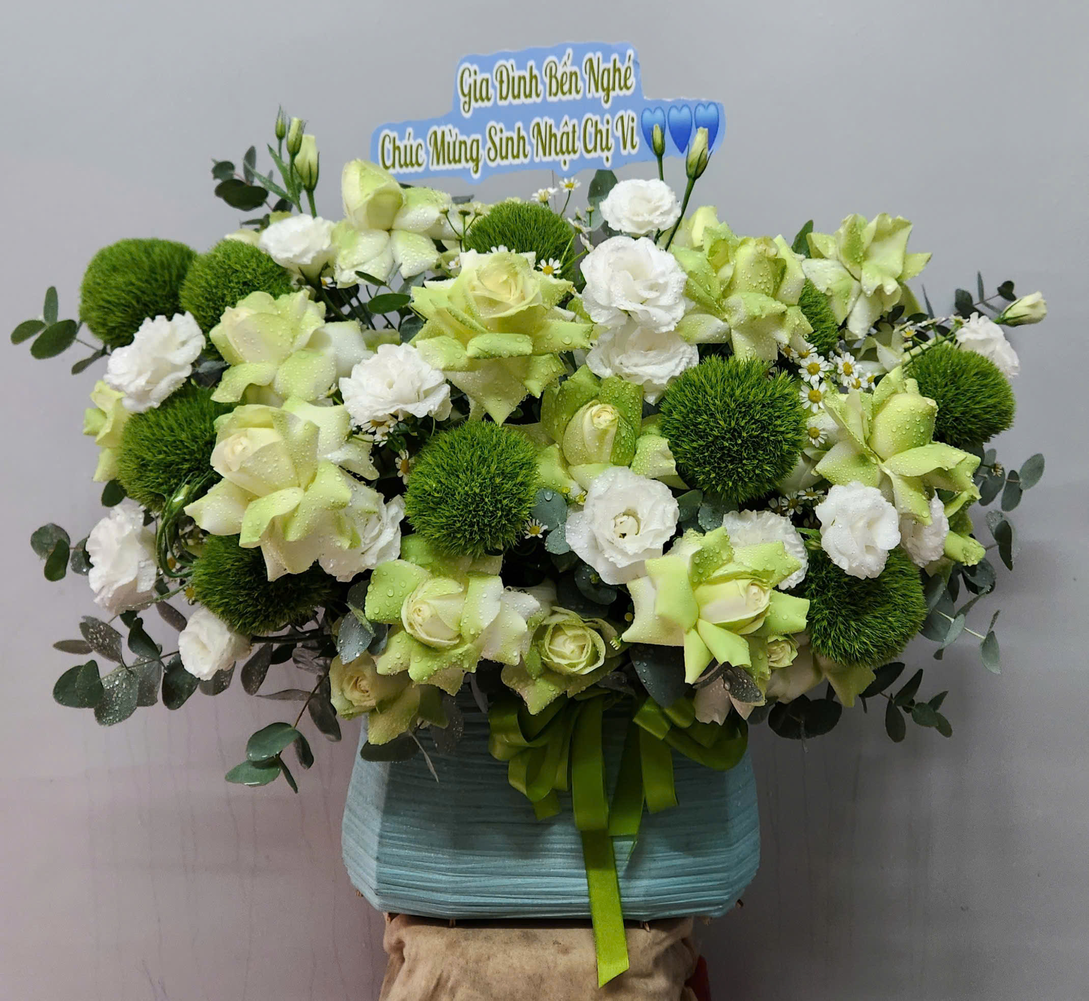 • Giỏ hoa xanh lá pastel: Mang vẻ đẹp nhẹ nhàng, tinh tế, phù hợp cho sinh nhật bạn bè, người yêu.