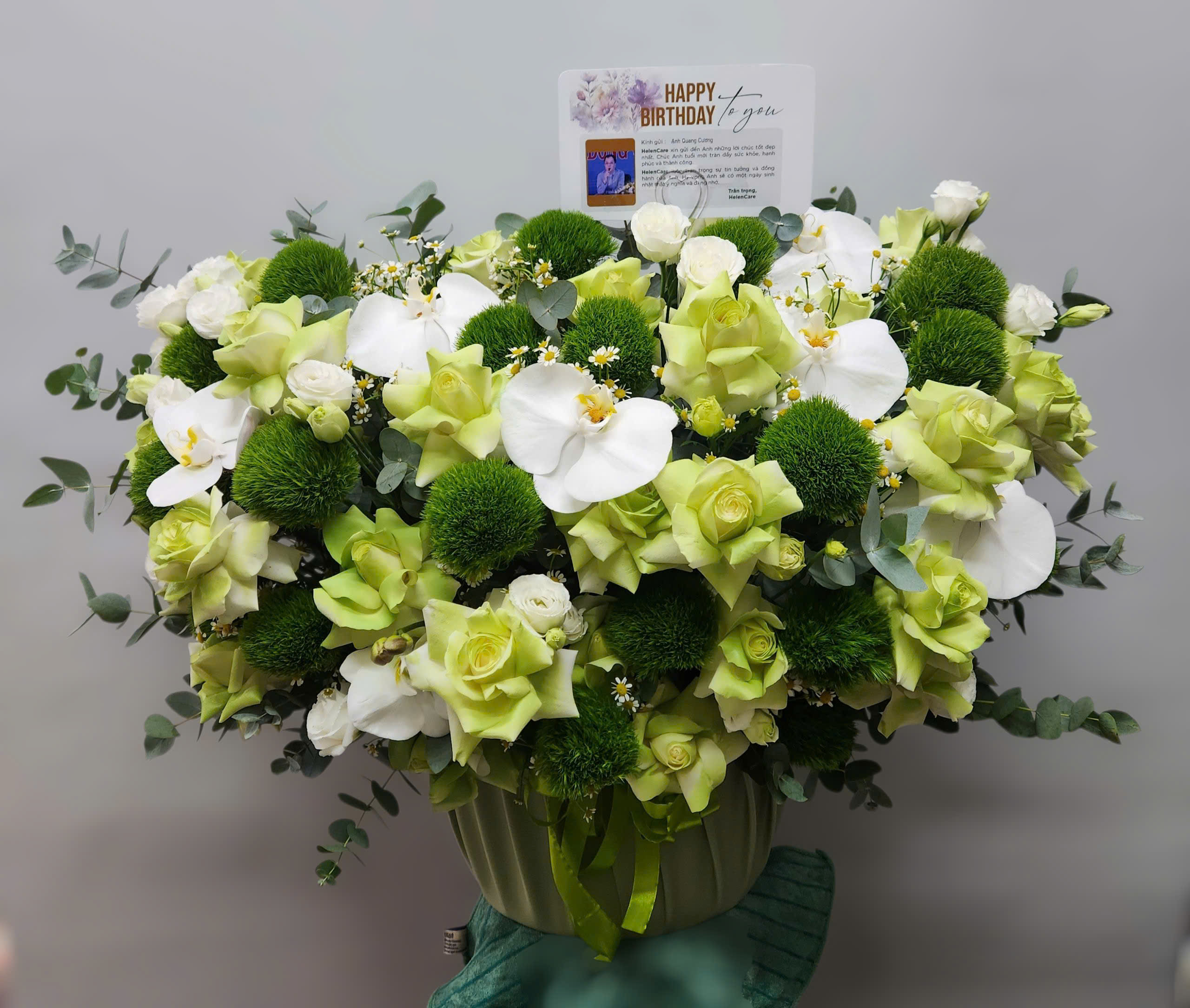 Trong nghệ thuật cắm hoa hiện đại, giỏ hoa tone xanh lá đang trở thành xu hướng được nhiều khách hàng ưa chuộng bởi sự mới mẻ, thanh thoát và mang ý nghĩa phong thủy tích cực. Nếu hoa hồng đỏ tượng trưng cho tình yêu nồng cháy, hoa hồng trắng đại diện cho sự thuần khiết, thì hoa xanh lá lại mang lại cảm giác bình yên, may mắn và khởi đầu tươi mới.