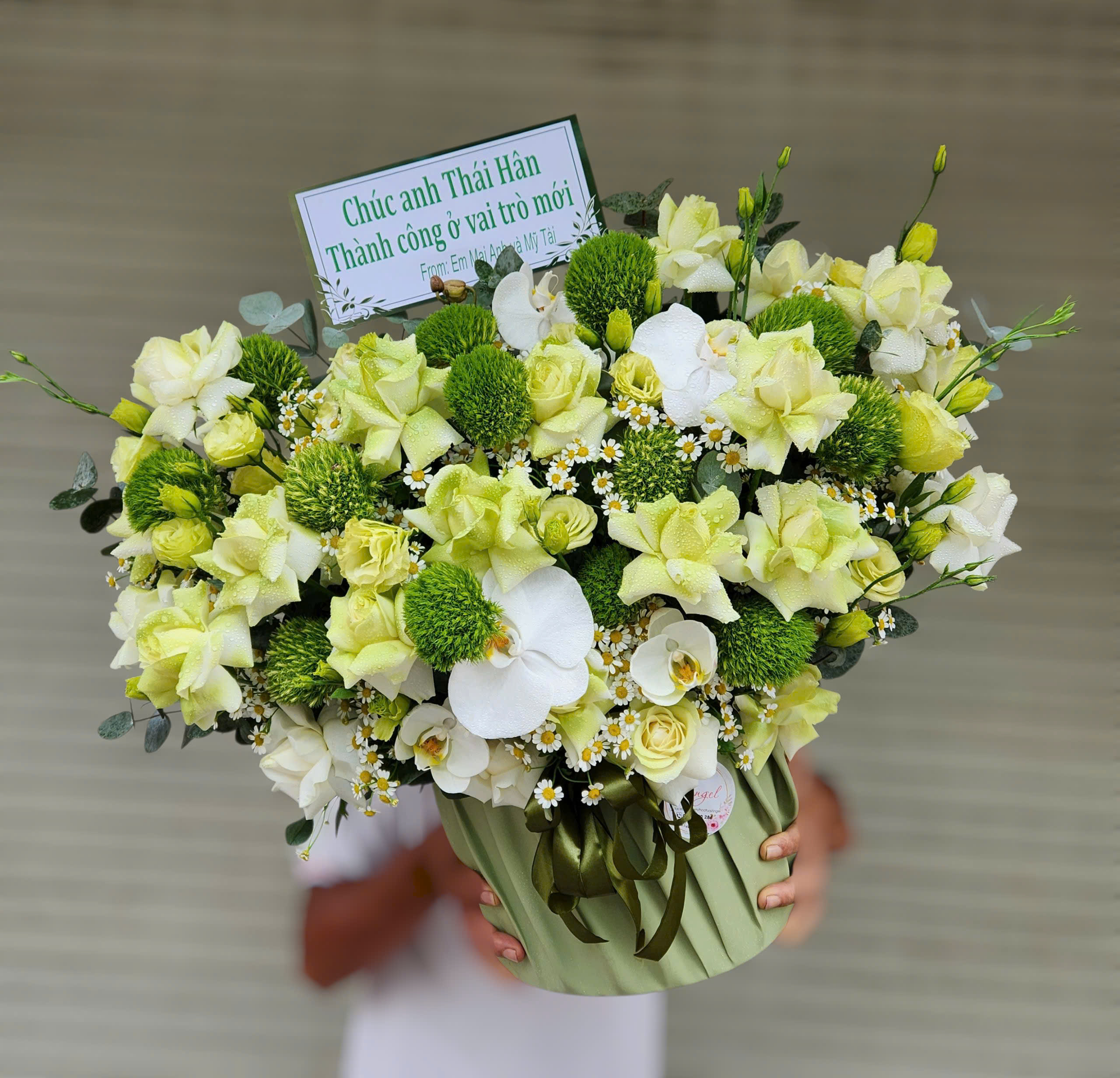 • Phong cách thanh lịch – hiện đại: Không quá rực rỡ, không quá trầm lắng, giỏ hoa xanh lá mang nét đẹp hài hòa, phù hợp với nhiều đối tượng.