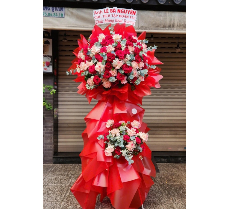 • Kệ hoa 3 tầng tone đỏ phát tài: Hoành tráng, thể hiện lời chúc thịnh vượng, cực kỳ thích hợp dành cho đối tác quan trọng.